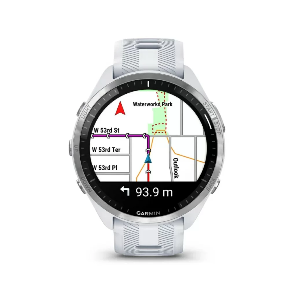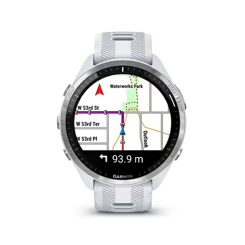 Беговые смарт-часы Forerunner 965 отображают на экране цветные встроенные карты, которые помогут вам не сбиться с маршрута и во время пробежки по городским улицам, и во время велосипедной поездки по лесной трассе.