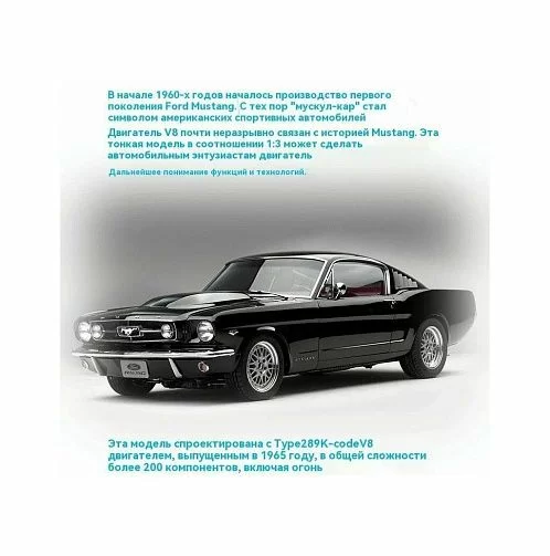 Более 200 компонентов показывают структуру и работу двигателя большого объема в мельчайших подробностях. И все работает по нажатию кнопки: зажигание искры, поршни движутся вверх и вниз вбок. При нажатии кнопки раздается классический мощный звук V8, от которого до сих пор бегут мурашки по коже. Официальное лицензирование Ford Motor Company гарантирует техническую и историческую корректность.