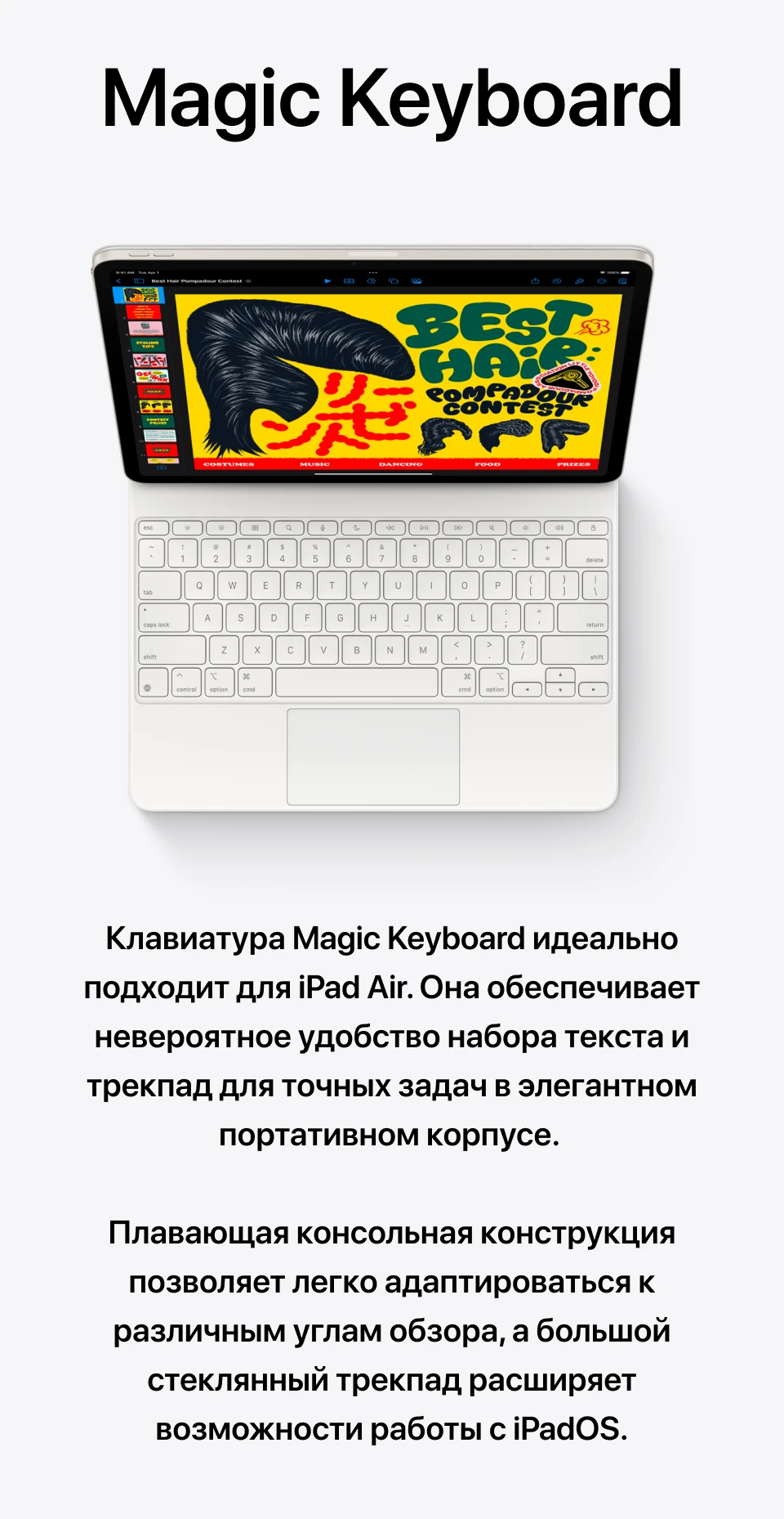 Magic Keyboard с рядом из 14 функциональных клавиш и увеличенным трекпадом превращает iPad Air в полноценную рабочую станцию. Клавиша поиска Spotlight, регулировка яркости и громкости одним нажатием, удобная клавиатура с ходом клавиш как у MacBook — всё это делает iPad Air конкурентом ноутбука для тех, чья работа не требует мыши.