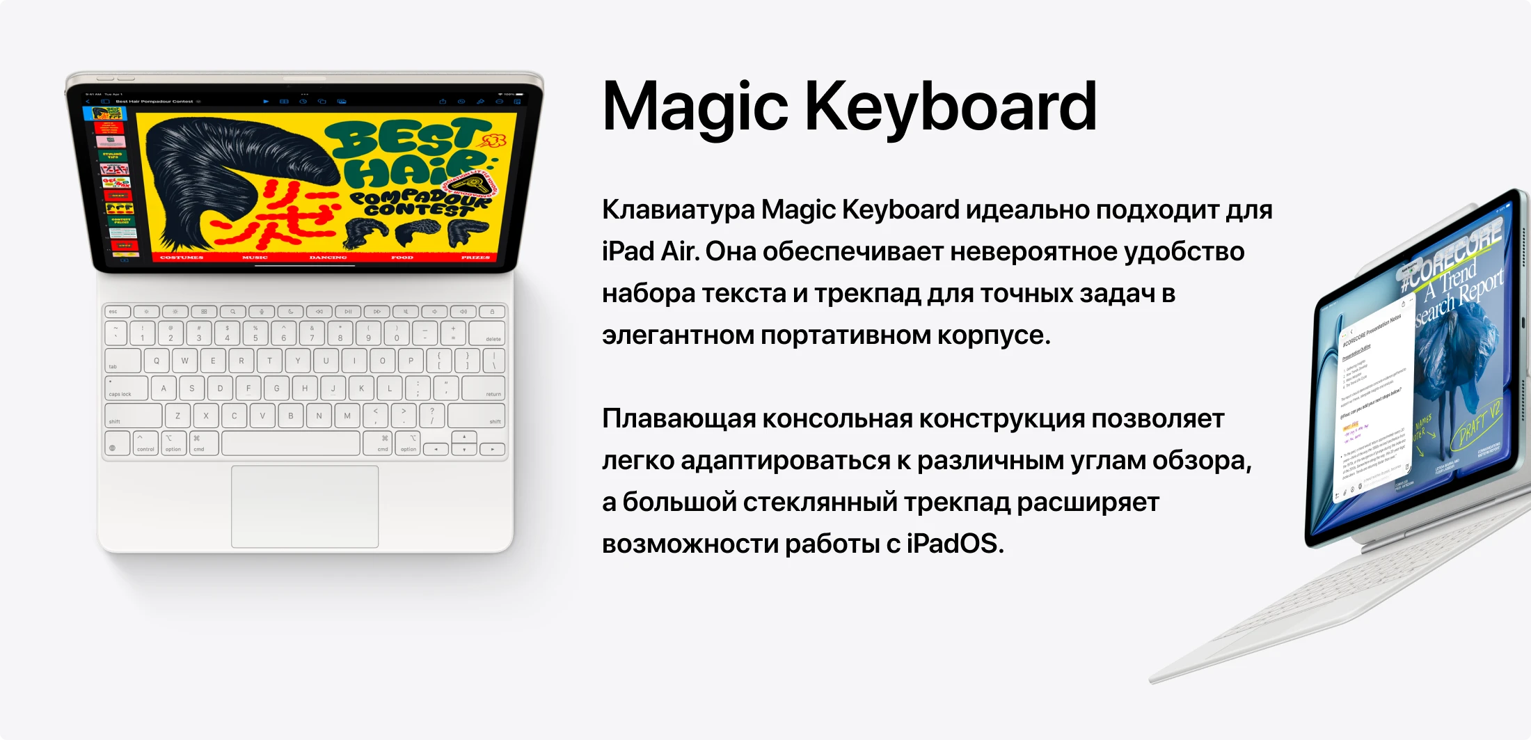 Magic Keyboard с рядом из 14 функциональных клавиш и увеличенным трекпадом превращает iPad Air в полноценную рабочую станцию. Клавиша поиска Spotlight, регулировка яркости и громкости одним нажатием, удобная клавиатура с ходом клавиш как у MacBook — всё это делает iPad Air конкурентом ноутбука для тех, чья работа не требует мыши.