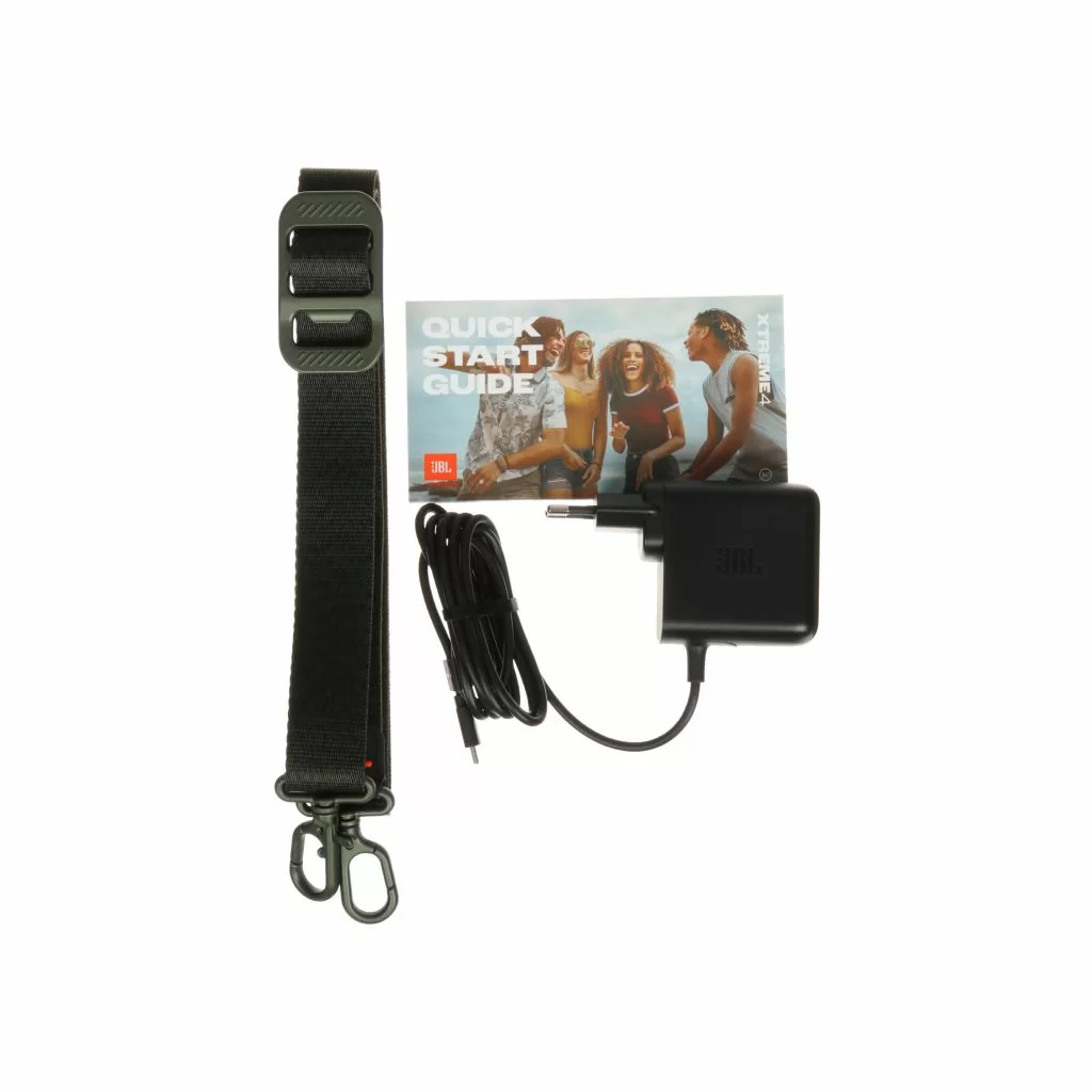 В комплект JBL Xtreme 4 входят сама колонка, зарядный кабель и документация. Колонка выполнена из высококачественных материалов: ткань, пластик и резина. Прочные металлические крепления для ремня позволяют носить её на плече, освобождая руки. Весит колонка всего 2 кг, что делает её удобной для переноски.