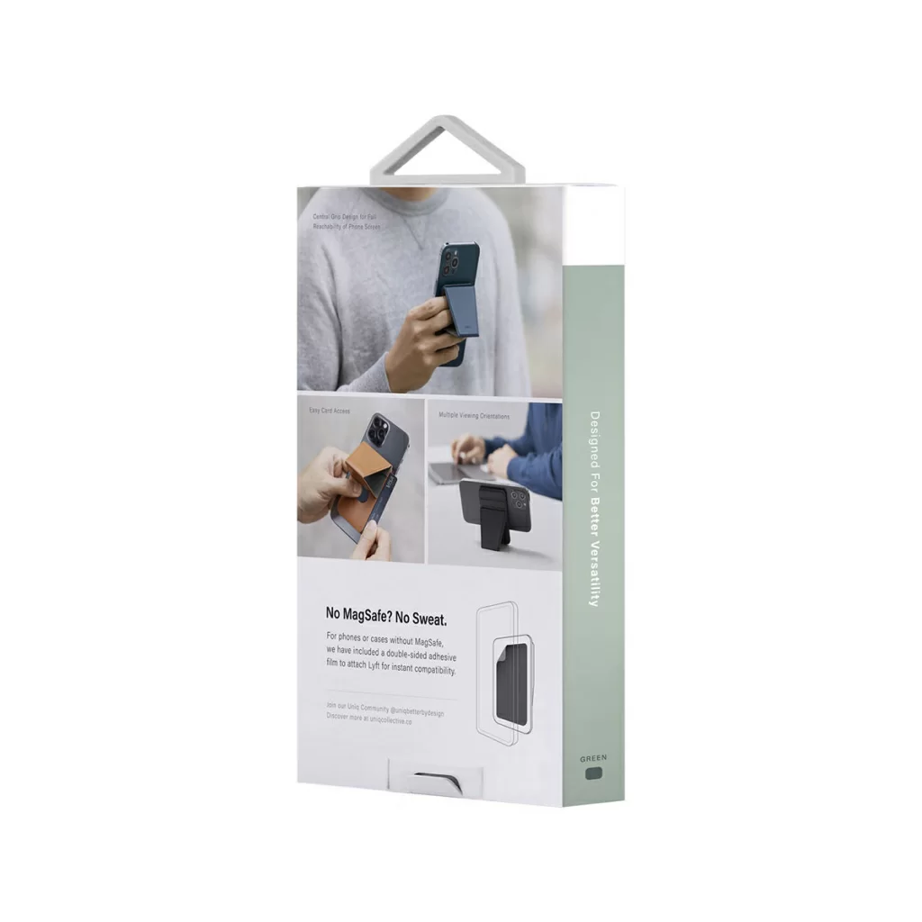 Uniq Lyft Magnetic - тонкая магнитная подставка/ручка для мобильного телефона и держатель для банковских карт. Просто установите его на MagSafe-совместимый телефон и наслаждайтесь просмотром в режиме видеозвонков или серфингом в сети Интернет. Телефон можно расположить как в портретной, так и в ландшафтной ориентации.
