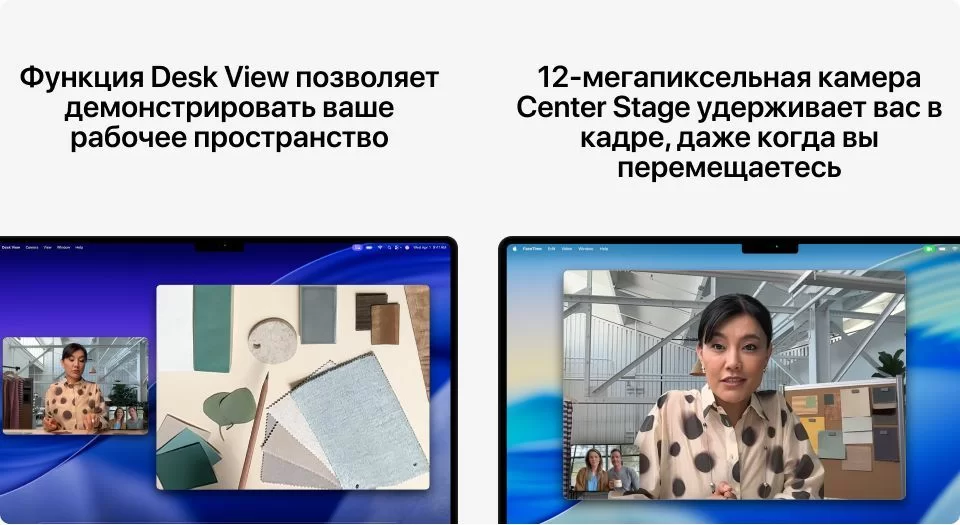 12‑Мп камера Center Stage сохраняет вас в кадре и показывает в лучшем свете при любом освещении. В паре с продвинутыми микрофонами и динамиками она даёт полный контроль над встречей — даже на расстоянии.