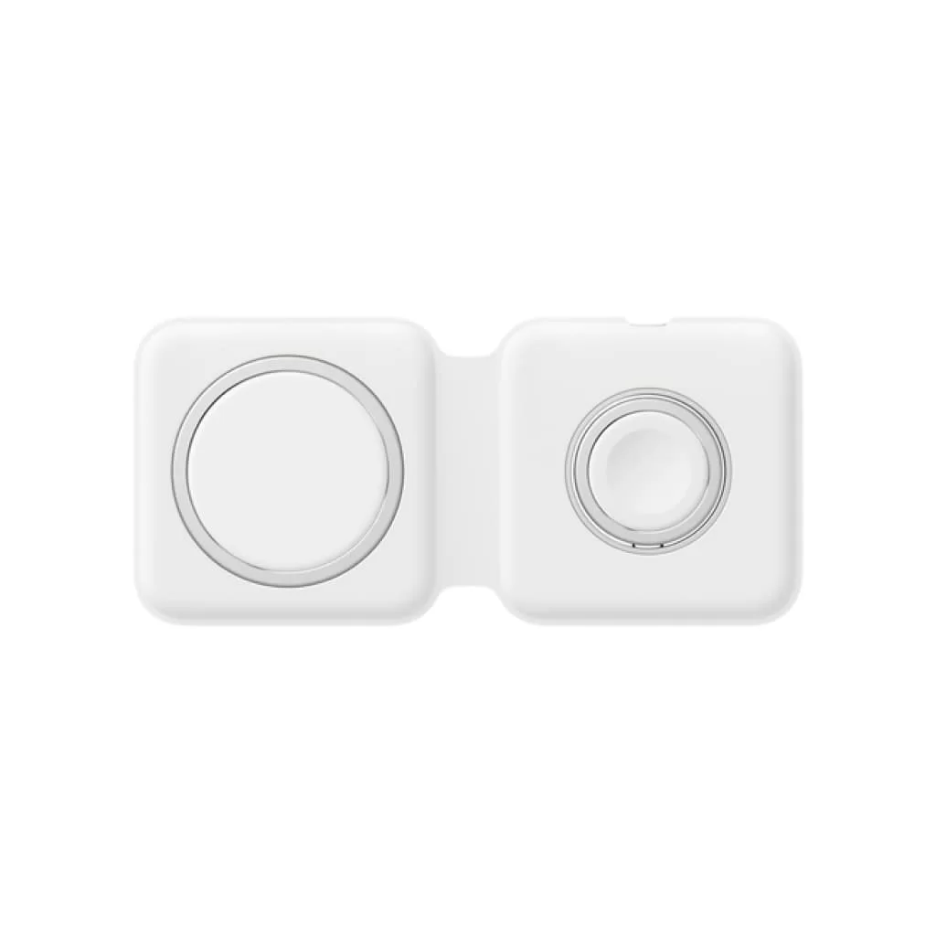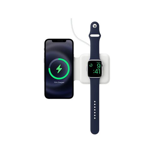 С двойным зарядным устройством MagSafe удобно заряжать совместимые модели iPhone и Apple Watch, беспроводной зарядный футляр для AirPods, а также другие устройства стандарта Qi. Просто положите их на зарядное устройство — и они начнут стабильно и эффективно заряжаться. Кроме того, зарядное устройство компактно складывается, поэтому его удобно брать с собой.