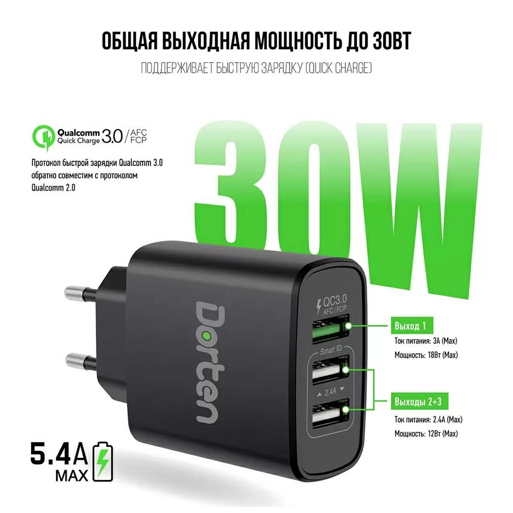 Dorten 30W QC+2 USB - это универсальный зарядник, который подойдет для любых устройств, включая планшеты, смартфоны и сотовые телефоны. С тремя разъемами USB вы можете заряжать три устройства одновременно, а один из трех разъемов поддерживает быструю зарядку до 80% за 25 минут благодаря технологии быстрой зарядки QC 3.0. Другие два порта USB обеспечивают быструю зарядку в общей сложности до 12Вт.