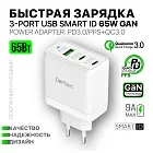 Сетевое зарядное устройство Dorten 3-Port USB Smart ID 65W GaN, PD3.0/PPS+QC3.0, белый
