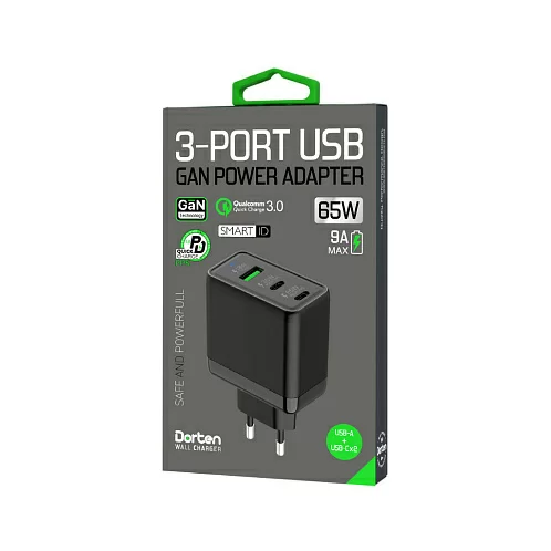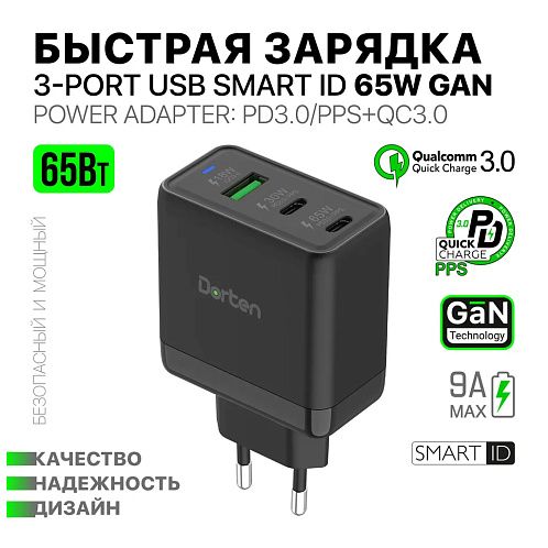 Сетевое зарядное устройство Dorten 3-Port USB Smart ID 65W GaN, PD3.0/PPS+QC3.0, черный