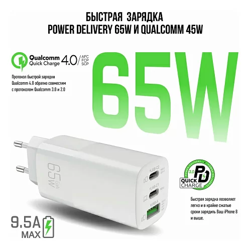 Сетевое зарядное устройство Dorten 3-Port USB Smart ID 65W GaN Power Adapter, белый