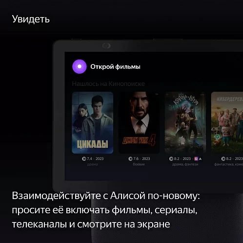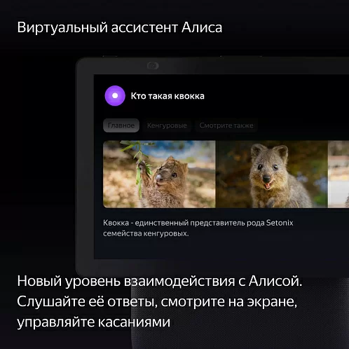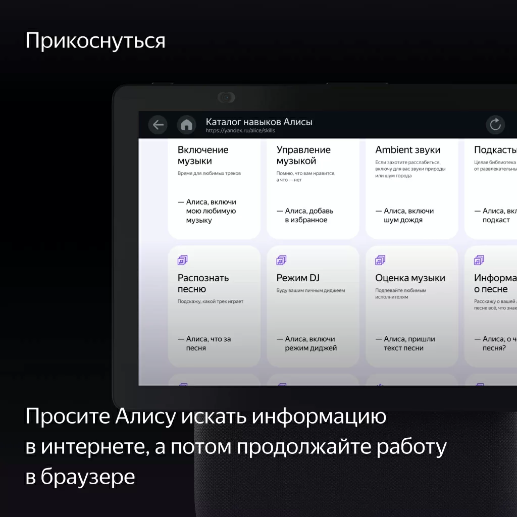 Просите Алису искать и включать музыку, фильмы или сериалы, а потом управляйте контентом на экране касаниями: перематывайте, ставьте на паузу и выбирайте нужное. Смотрите телеканалы. Задавайте Алисе вопросы — и не только слушайте её ответы, но и смотрите их на экране. Или пользуйтесь браузером.