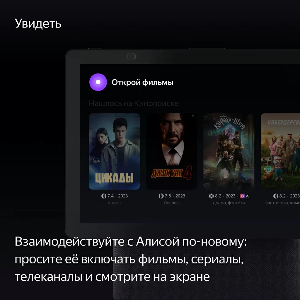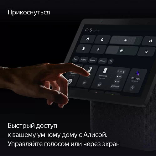 Просите Алису искать и включать музыку, фильмы или сериалы, а потом управляйте контентом на экране касаниями: перематывайте, ставьте на паузу и выбирайте нужное. Смотрите телеканалы. Задавайте Алисе вопросы — и не только слушайте её ответы, но и смотрите их на экране. Или пользуйтесь браузером.
